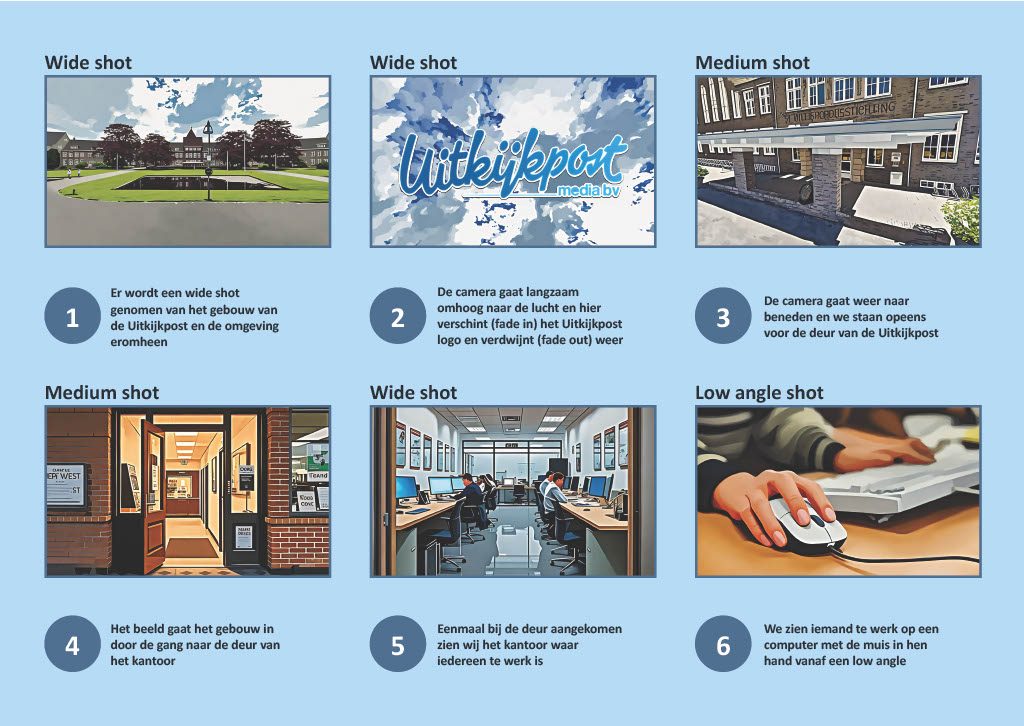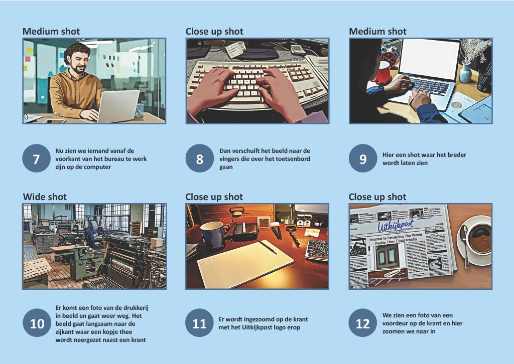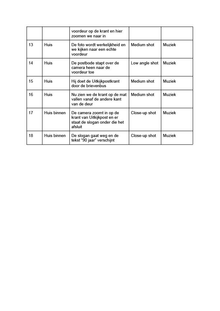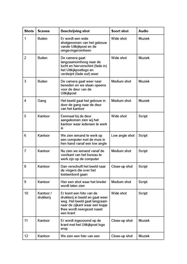 Van dit storybord werd een draaiboek gemaakt. Simpel gezegd het storybord maar in tekstvorm. Hierbij konden we ook gelijk erbij zetten wat voor soort shot het zou zijn en de audio die erbij paste.