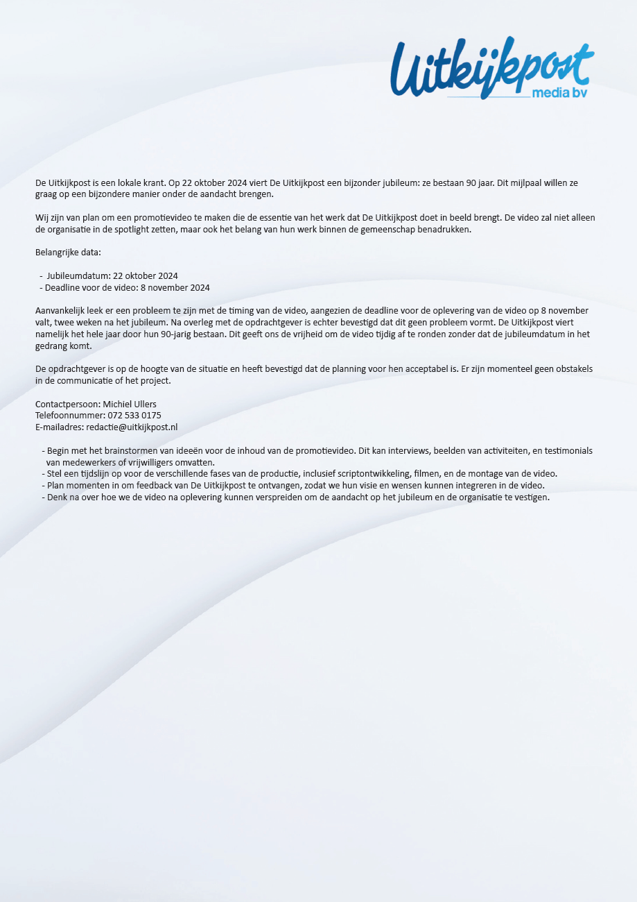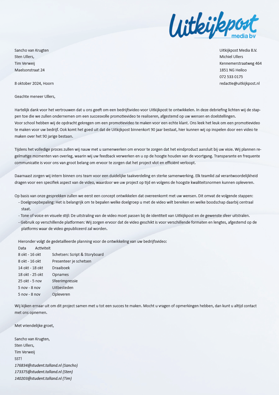 Ondertussen moesten we het al een beetje met de klant over hebben wat en waar we nou eigenlijk een promotievideo over zouden maken dat betrekking heeft op de Uitkijkpost. Dit hebben ik samen met een groepsgenoot (Sten Ullers) samengeavt in het klant-contact.