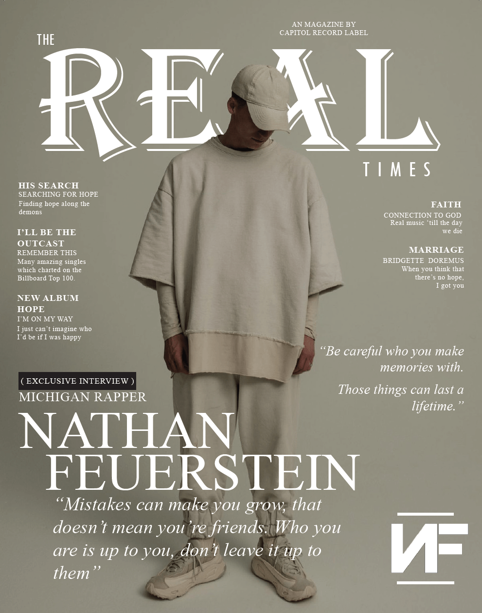 Voor een schoolopdracht moest ik een magazine cover ontwerpen en ik mocht mijn eigen idool als onderwerp kiezen. Ik koos NF als de artiest voor mijn cover, aangezien hij mijn favoriete artiest is. Het ontwerp heb ik gemaakt met behulp van Adobe InDesign. Op de cover plaatste ik een krachtige foto van NF, gecombineerd met opvallende typografie om de titel en de hoofdartikelen te benadrukken. De kleuren en stijlen die ik gebruikte, weerspiegelen de sfeer van zijn muziek. Ik koos voor een minimalistische aanpak om de aandacht volledig op NF te richten. Het eindresultaat is een visueel aantrekkelijke cover die zowel mijn ontwerpvaardigheden als mijn waardering voor NF laat zien. Deze ervaring heeft mijn kennis en gebruik van InDesign aanzienlijk verbeterd. Voor mij was dit de leukste opdracht van het jaar.